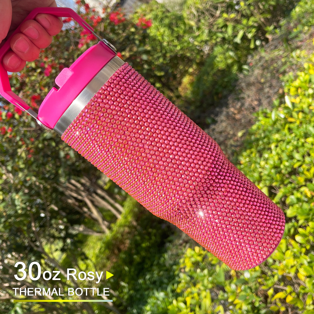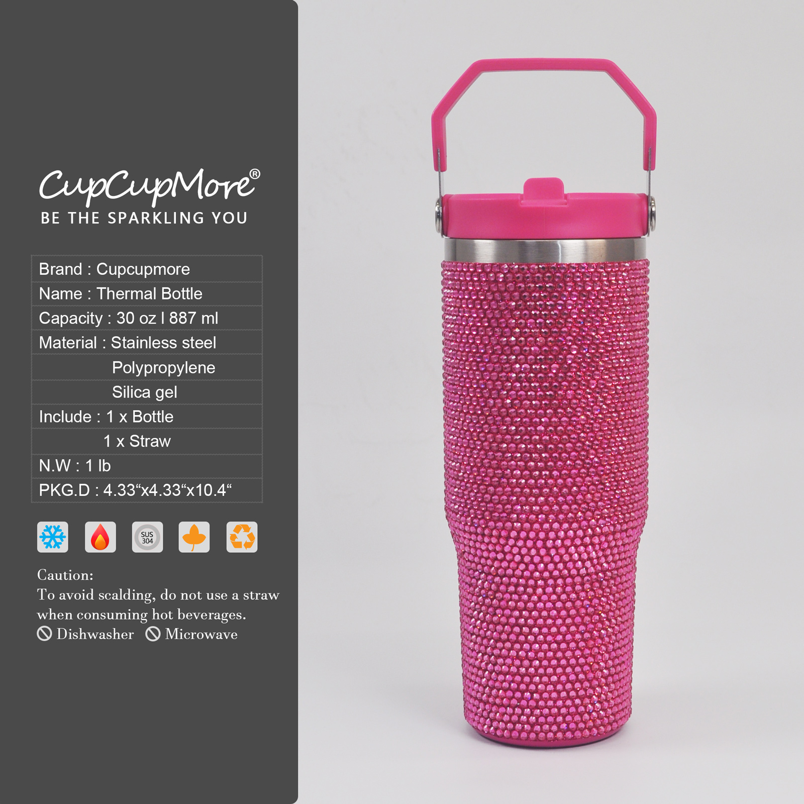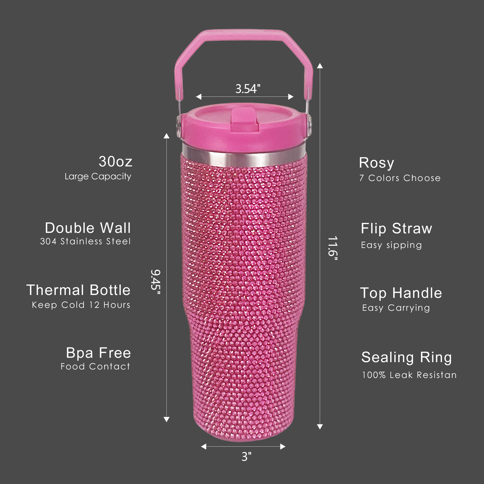 Cupcupmore 30 oz Rosy Bling Rhinestone Stainless Steel Glitter Sippy Tumbler Vacuum Insulated Thermal Water Bottle with Flip Straw & Lid &Handle, Leakproof Sparkly Car Cup Holder for Drinks & Coffee, Keeps Cold 12 Hours for Office, Gym, Travel
