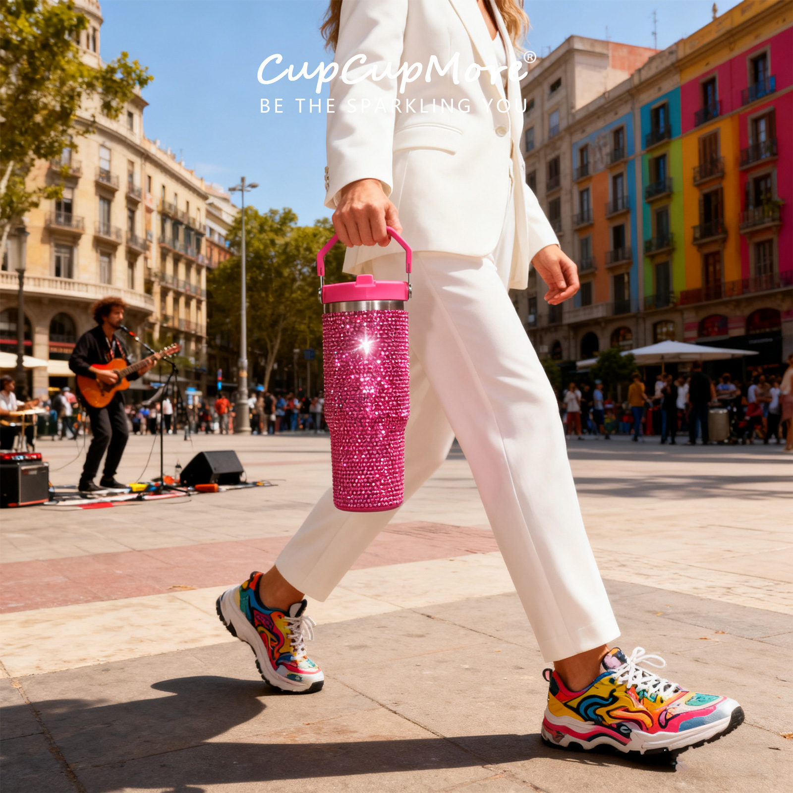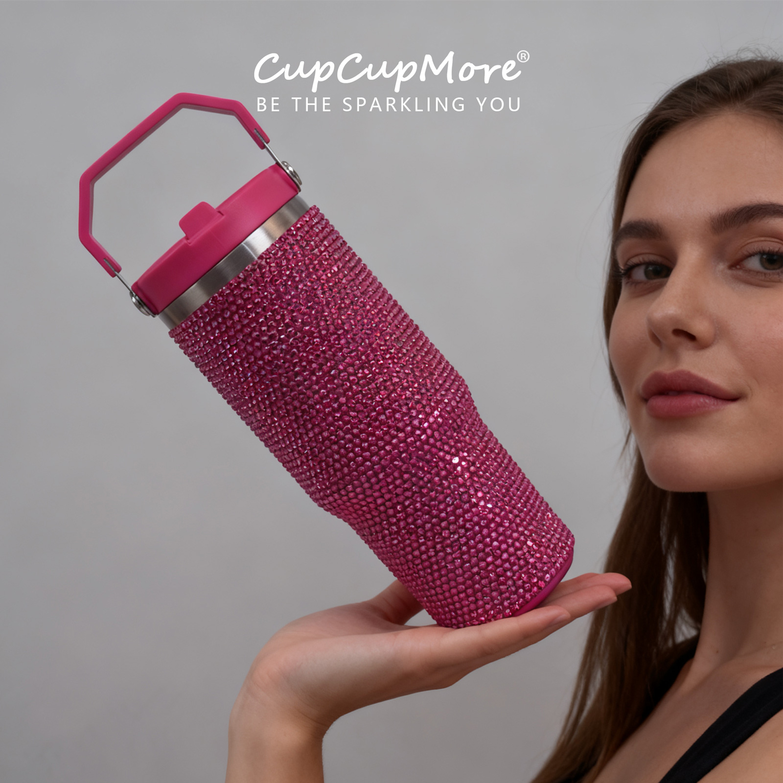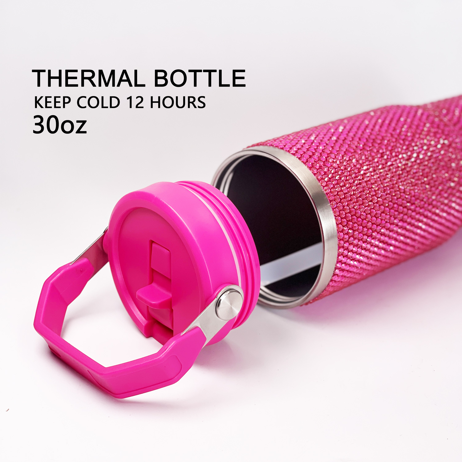 Cupcupmore 30 oz Rosy Bling Rhinestone Stainless Steel Glitter Sippy Tumbler Vacuum Insulated Thermal Water Bottle with Flip Straw & Lid &Handle, Leakproof Sparkly Car Cup Holder for Drinks & Coffee, Keeps Cold 12 Hours for Office, Gym, Travel
