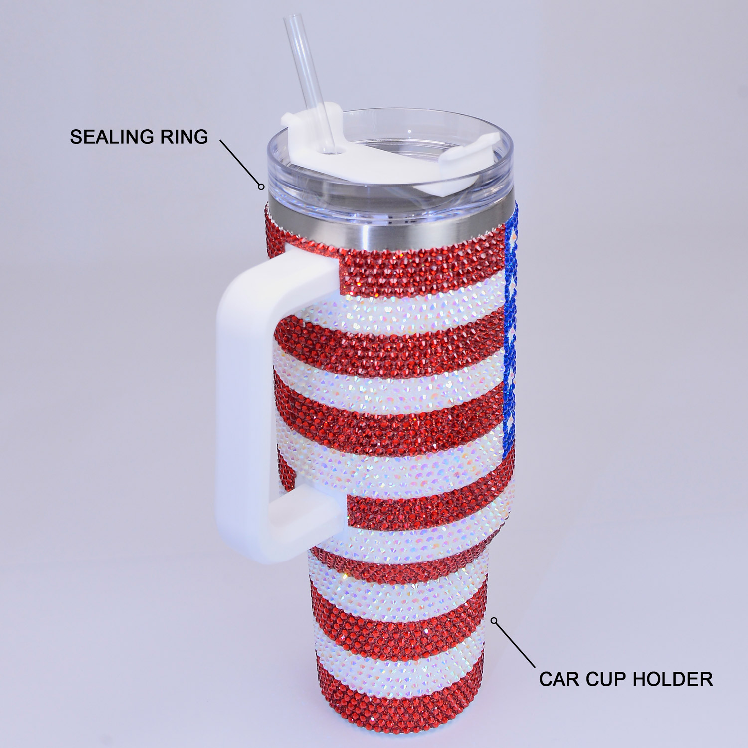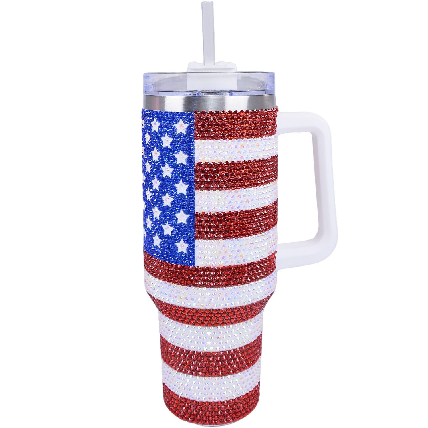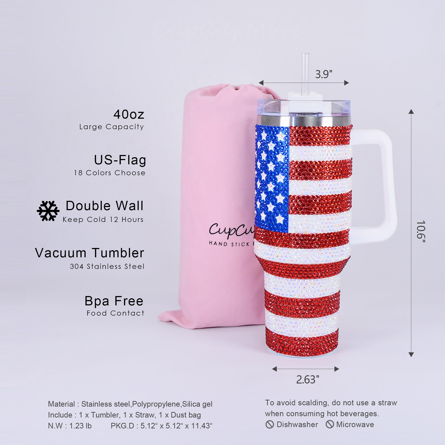 Cupcupmore 40 oz US-Flag Bling Rhinestone Stainless Steel Sippy Tumbler Glitter Vacuum Insulated Thermal Water Bottle with Straw & Lid &Handle,Sparkle Car Cup Holder,Keeps Cold 12 Hours Drinks,Coffee